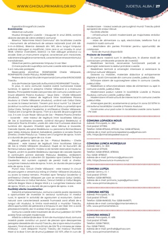 WWW.GHIDULPRIMARIILOR.RO JUDE%u021aUL ALBA / 27Expozi%u021bia Etnografic%u0103%u00a0LivezileEvenimente:Obiective culturaleMuzeul Etnografic Livezile %u2013 inaugurat %u00een anul 2006, con%u021bine obiecte donate de c%u0103tre cet%u0103%u021benii comuneiBiserica %u201dAdormirea Maicii Domnului%u201d din localitatea Livezile %u2013 monument de arhitectur%u0103 de valoare na%u021bional%u0103 (cod LMI ABII-m-A-00244). Biserica dateaz%u0103 din 1611, de-a lungul timpului suferind distrugeri %u0219i modific%u0103ri, %u00eentre care %u0219i un incediu %u00een anul 1848. Ulterior incendierii, bisericii i-a fost ad%u0103ugat pridvorul cu arcade. Este un monument original, caracterizat prin masivitate, sobrietate %u0219i bog%u0103%u021bie ornamental%u0103, caracteristice renascentismului transilv%u0103nean.Obiective pentru petrecerea timpului %u00een aer liberO mare parte din suprafa%u021ba comunei Livezile este acoperit%u0103 de 5 arii naturale protejate:Rezerva%u021biile %u0219tiin%u021bifice: RONPA0038 Cheile V%u0103li%u0219oarei, RONPA0076 Cheile Plaiului, RONPA0096Pe%u0219tera de la Gro%u0219i Situl de Importan%u021b%u0103 Comunitar%u0103 ROSCI0253 Trasc%u0103uAria de Protec%u021bie Special%u0103 Avifaunistic%u0103 ROSPA0087 Trasc%u0103u%u00cen plus, %u00een zona comunei noastre exist%u0103 numeroase trasee turistice, %u00een special %u00een preajma Cheilor V%u0103li%u0219oarei %u0219i a masivului Bedelu. Principalele trasee care pornesc din comuna Livezile sunt: Cruce albastr%u0103: Poiana Aiudului %u2013 %u0218aua Data %u2013 Cheile V%u0103li%u0219oarei (Aiudului) - este traseul de leg%u0103tur%u0103 %u00eentre localitatea Poiana Aiudului %u0219i Cheile V%u0103li%u0219oarei (Aiudului), urc%u00e2nd sub Col%u021bul Data, cu acces la traseul tematic. Trecem prin locul numit %u201cLa G%u0103vane%u201d (scobituri cu ochiuri de ap%u0103) %u0219i urc%u0103m sub Vf. Data, cu priveli%u0219ti spre Col%u021bul Data, Templul Cavalerilor %u0219i amfiteatrul Cheilor V%u0103li%u0219oarei. Traseul are o lungime de aprox. 7 km %u0219i o durat%u0103 de parcurgere de cca. 3-4 ore. Cruce Ro%u0219ie: S%u0103lciua de Jos %u2013 Pe%u0219tera Poarta Zmeilor %u2013 Izvoarele - este traseul de leg%u0103tur%u0103 %u00eentre localitatea S%u0103lciua de Jos %u0219i localitatea Izvoarele, vizit%u00e2nd Abruptul Bedeleului %u0219i rezerva%u021bia Poarta Zmeilor, unele din cele mai frumoase obiective turistice din Apuseni. Priveli%u0219ti spre satul S%u0103lciua %u0219i Izvoarele, Cascada %u0218ipote, abruptul Bedeleului cu panorama fermec%u0103toare spre Valea Arie%u0219ului (balcon belvedere), pe%u0219tera %u0219i arcada Poarta Zmeilor, Cheile Plaiului %u0219.a. Traseul are o lungime de aprox. 14 km %u0219i o durat%u0103 de parcurgere de cca. 6 oreBand%u0103 galben%u0103: S%u0103lciua de Jos %u2013 Platoul Bedeleu %u2013 Cheile V%u0103li%u0219oarei - este traseul de leg%u0103tur%u0103 %u00eentre localitatea S%u0103lciua de Jos %u0219i Cheile V%u0103li%u0219oarei (Aiudului). Dup%u0103 ce ne bucur%u0103m de farmecul satului specific mo%u021besc %u0219i de tainele rezerva%u021biei Huda lui Papar%u0103, urc%u0103m la poalele Bedeleului (aproape de cascada %u0218ipote) %u0219i continu%u0103m printre dolinele Platoului Bedeleu, str%u0103batem Cheile Bedeleului %u0219i cobor%u00e2m Dl. %u0218ipotelor spre Castelul Templul Cavalerilor. Aici suntem cople%u0219i%u021bi de pere%u021bii %u00eenal%u021bi ai cheilor. Lungimea traseului este de aprox. 14 km, iar durata de parcurgere este de aprox. 6 ore. Punct ro%u0219u: Circuit Cheile V%u0103li%u0219oarei - este traseul %u00een circuit de parcurgere a versantului st%u00e2ng al Cheilor V%u0103li%u0219oarei (Aiudului), cu acces la traseul tematic. Priveli%u0219ti spre Templul Cavalerilor %u0219i amfiteatrul Cheilor V%u0103li%u0219oarei pe care se remarc%u0103 Col%u021bul Cet%u0103%u021bii, Col%u021bul Deacului %u0219i Col%u021bul Sandului, %u021aancul Cet%u0103%u021bii %u0219i Col%u021bul Bogza, v%u00e2rfurile Bogza Mare %u0219i Bogza Mic%u0103 %u0219 a. Lungimea traseului este de aprox. 10 km, cu o durat%u0103 de parcurgere de aprox. 4 ore.Facilit%u00e3%u0163i oferite investitorilor:Datorit%u0103 amplasamentului, comuna Livezile poate reprezenta o oportunitate de investi%u021bie %u00een sectorul turismului %u00een mediul rural, %u00een special %u00een activit%u0103%u021bi de agroturism %u0219i ecoturism. Cadrul natural care caracterizeaz%u0103 aceast%u0103 frumoas%u0103 zon%u0103 aflat%u0103 de-a lungul v%u0103ii Aiudului, la limita nord-vestic%u0103 a mun%u021bilor Trasc%u0103u, ofer%u0103 oportunit%u0103%u021bi de petrecere a timpului %u00een aer liber %u00eentr-o zon%u0103 pitoreasc%u0103 lini%u0219tit%u0103, dar %u00een acela%u0219i timp u%u0219or accesibil%u0103.Comuna Livezile este traversat%u0103 de drumul jude%u021bean DJ 107M acesta fiind complet modernizat.Aflat%u0103 la o distan%u021b%u0103 de doar 10 km de municipiul Aiud, comuna noastr%u0103 poate constitui un punct de plecare spre descoperirea peisajelor deosebite din mun%u021bii Trasc%u0103u, dar %u0219i spre restul mun%u021bilor Apuseni, fiind situat%u0103 la circa 20 km de DN 75 %u0219i intrarea pe Valea Arie%u0219ului %u2013 care desparte mun%u021bii Trasc%u0103u de masivul Muntele Mare %u0219i la doar 5 km de drumul jude%u021bean DJ 107I, aflat %u00een curs de modernizare - traseul acestuia parcurg%u00e2nd mun%u021bii Trasc%u0103u p%u00e2n%u0103 apropiere de ora%u0219ul Abrud.Facilit%u0103%u021bi oferite:- infrastructur%u0103 rutier%u0103 modernizat%u0103 pe majoritatea str%u0103zilor din comun%u0103- re%u021bea de alimentare cu ap%u0103, electricitate, telefonie fix%u0103 %u0219i mobil%u0103 %u00een toat%u0103 comun%u0103 - deschidere din partea Prim%u0103riei pentru oportunit%u0103%u021bi de colaborare - for%u021b%u0103 de munc%u0103 disponibil%u0103Proiecte de investi%u0163ii:%u00cen comuna noastr%u0103 sunt %u00een desf%u0103%u0219urare, %u00een diverse stadii de contractare urm%u0103toarele proiecte de investi