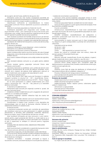 WWW.GHIDULPRIMARIILOR.RO JUDE%u021aUL ALBA / 31de scurgere, alei de furaje, platforme de gunoi, etc)%u00cenfiin%u0163area uneia sau mai multor cooperative (societ%u0103%u0163i de marketing) care s%u0103 preia produsele prime sau finite de la popula%u0163ie %u00een vederea valorific%u0103rii, dup%u0103 modelul occidentalValorificarea ineficient%u0103 %u015fi nesatisf%u0103c%u0103toare la nivelul comunit%u0103%u0163ii (comunei Ponor) reprezint%u0103 %u015fi punctul vulnerabil al localit%u0103%u0163ii.Referitor la evolu%u0163ia popula%u0163iei %u015fi a for%u0163ei de munc%u0103:Stabilizarea popula%u0163iei prin asigurarea unor condi%u0163ii mai bune familiilor tinere - prin crearea de noi locuri de munc%u0103, prin %u00eenfiin%u0163area unor unit%u0103%u0163i care s%u0103 valorifice materiile prime pe plan local %u00een special %u00een prest%u0103ri de servicii %u015fi zootehnieEste necesar%u0103 acordarea de facilit%u0103%u0163i (%u00eemprumuturi pe termen lung cu dob%u00e2nzi mici) pentru construirea de locuin%u0163e, procurarea de animale %u015fi material agricol, cump%u0103r%u0103ri de materiale de construc%u0163iiAprobarea de material lemnos pentru construirea de locuin%u0163e, grajduri, f%u00e2nare, etc.%u00cen domeniul s%u0103n%u0103t%u0103%u0163ii:Punerea %u00een folosin%u021b%u0103 a noului dispensar %u00a0uman %u0219i veterinar%u00cenfiin%u0163area unui cabinet stomatologic%u00cenfiin%u021barea unei farmacii umane %u0219i veterinareSpa%u0163iu corespunz%u0103tor pentru punctul sanitar din satul GeogelAsigurarea unei ambulan%u0163e permanente la dispensarul Ponor.Prest%u0103ri serviciiSe va avea %u00een vedere %u00eenfiin%u0163area unei unit%u0103%u0163i-atelier de cojoc%u0103rie, croitorieEste necesar%u0103 dotarea comunei cu un gater pentru debitat lemneFoarte necesar pentru popula%u0163ia comunei Ponor este %u00eenfiin%u0163area unei brut%u0103riiAsocierea, formarea %u015fi profilarea unor unit%u0103%u0163i de servicii care s%u0103 asigure achizi%u0163ionarea de fructe de p%u0103dure (m%u0103cie%u015fe, mure, zmeur%u0103, etc.), ciuperci de p%u0103dure (hrib, g%u0103lbior,etc.) precum %u015fi plante medicinale care se g%u0103sesc din abunden%u0163%u0103 %u00een zon%u0103%u00cen domeniul infrastructurii:Se vor face eforturi de a g%u0103si sursa de finan%u0163are %u00een vederea %u00eenceperii lucr%u0103rilor la drumul DJ %u2013 107 I Aiud-R%u00e2me%u0163, PonorS%u0103lciua, precum %u015fi deschiderea drumului DJ 107 I %u2013 Ponor- Mogo%u015fSe va avea permanent %u00een vedere modernizarea prin orice mijloc a drumurilor DC %u2013 105, DC %u2013 106, precum %u015fi a celorlalte drumuri comunale%u00cen domeniul %u00eenv%u0103%u0163%u0103m%u00e2ntului:Men%u0163inerea st%u0103rii actuale prin repara%u0163ii curente la %u00a0%u015fcoala %u00a0de pe raza comunei PonorCre%u015fterea calit%u0103%u0163ii %u00eenv%u0103%u0163%u0103m%u00e2ntului prin angajarea de personal calificat ca o condi%u0163ie primordial%u0103Cre%u015fterea exigen%u0163ei cadrelor didactice fa%u0163%u0103 de nivelul de preg%u0103tire al elevilorStimularea material%u0103 a elevilor care sunt nevoi%u0163i s%u0103 fac%u0103 naveta pe jos la %u015fcoal%u0103 de la o distan%u0163%u0103 mai mare de 5 kmIntroducerea %u00een mediul rural- montan a unor discipline de montanologie care s%u0103 duc%u0103 la formarea viitorilor fermieri %u015fi stabilizarea acestora %u00een aceast%u0103 zon%u0103.Protec%u0163ia social%u0103:%u00cen domeniul protec%u0163iei sociale prin comisiile de specialitate ale Consiliului Local se va avea permanent %u00een vedere ocrotirea persoanelor %u015fi familiilor f%u0103r%u0103 posibilit%u0103%u0163i materiale, b%u0103tr%u00e2nilor bolnavi %u015fi singuri. Avem 173 pensionari de stat sau urma%u015fiEste necesar%u0103 %u00eenfiin%u0163area, pe raza comunei, a unui c%u0103min%u015fcoal%u0103 pentru copiii proveni%u0163i din familii cu mul%u0163i copii %u015fi cu o situa%u0163ie material%u0103 mai slab%u0103. %u00cen timpul perioadei mai-octombrie ei pot fi repartiza%u0163i la cet%u0103%u0163eni %u00een comun%u0103 pentru %u00eengrijirea animalelorPOSIBILIT%u0102%u0162I DE DEZVOLTARE, OBSERVA%u0162II PRECIZ%u0102RIPuncte forte:Zon%u0103 euromontan%u0103 considerat%u0103 ca apar%u0163in%u00e2nd grupului celor mai s%u0103race comune, definit%u0103 ca zon%u0103 defavorizat%u0103Cuprins%u0103 %u00een regiunea a VII de dezvoltare rural%u0103 a Rom%u00e2nieiComuna Ponor beneficiaz%u0103 de condi%u0163ii ecologice favorabile cu mult sub L.M.A. de substan%u0163e poluante %u2013 aer, ap%u0103, sol - %u015fi ob%u0163inerea de produse pur ecologiceCre%u015fterea animalelor %u2013 ocupa%u0163ia principal%u0103 %u015fi sigur%u0103 a locuitorilor comunei, activitate dus%u0103 prin munc%u0103 p%u00e2n%u0103 la sacrificiu %u2013 tradi%u0163ie de necontestat a ponorenilorConcluzii certe privind stabilirea popula%u0163iei tinere %u00een zon%u0103 dup%u0103 perioada post-decembrist%u0103 de%u015fi condi%u0163iile de via%u0163%u0103 nu s-au %u00eembun%u0103t%u0103%u0163itPreten%u0163ia popula%u0163iei fa%u0163%u0103 de condi%u0163iile de trai este redus%u0103Comuna Ponor poate fi o zon%u0103 agroturistic%u0103 de excep%u0163ie, fiind favorizat%u0103 de condi%u0163iile naturalePuncte vulnerabile:Infrastructura nesatisf%u0103c%u0103toare la nivel local caracterizat%u0103 prin lipsa drumurilor de acces la gospod%u0103riile popula%u0163iei sau spre zonele agroturisticeDatorit%u0103 condi%u0163iilor nesatisf%u0103c%u0103toare de ad%u0103postire a animalelor produc%u0163iile sunt %u00eenc%u0103 mici cu mult sub poten%u0163ialul genetic al animalelorComunica%u0163iile la nivelul comunei sunt %u00een faza incipient%u0103 %u015fi nu asigur%u0103 un grad corespunz%u0103tor %u015fi prompt de comunicare %u015fi informarePopula%u0163ia activ%u0103 pe v%u00e2rst%u0103:20-40 ani = 20%40-60 ani = 19%TOTAL%u00a0%u00a0%u00a0%u00a0 %u00a0 %u00a0%u00a0 39% reprezint%u0103 un procent %u00eenc%u0103 micNivelul de cultur%u0103 %u015fi civiliza%