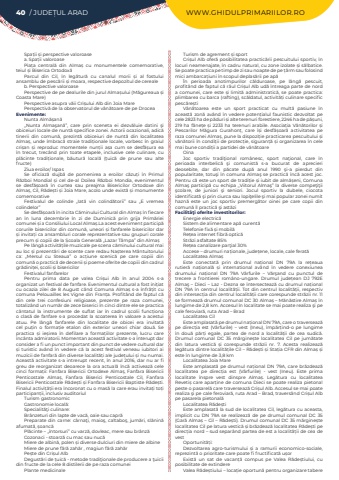 40 / JUDE%u021aUL ARAD WWW.GHIDULPRIMARIILOR.ROSpa%u021bii %u0219i perspective valoroasea. Spa%u021bii valoroasePia%u021ba central%u0103 din Alma%u0219 cu monumentele comemorative, teiul %u0219i Biserica Ortodox%u0103Parcul din Cil, %u00een leg%u0103tur%u0103 cu canalul morii %u0219i al fostului ansamblu de pesc%u0103rii %u0219i moara, respective depozitul de cerealeb. Perspective valoroasePerspective de pe dealurile din jurul Alma%u0219ului (M%u0103gureaua %u0219i Coasta Mare)Perspective asupra v%u0103ii Cri%u0219ului Alb din Joia MarePerspectiv%u0103 de la observatorul de v%u00e2n%u0103toare de pe DroceaEvenimente:Nunta Alm%u0103%u0219an%u0103,,Nunta Alma%u015fan%u0103%u201d, care prin sceneta ei dezv%u0103luie datini %u015fi obiceiuri locale de nunt%u0103 specifice zonei. Actorii ocazionali, adic%u0103 tinerii din comun%u0103, prezint%u0103 obiceiuri de nunt%u0103 din localitatea Alma%u0219, unde %u00eembrac%u0103 straie tradi%u021bionale locale, vorbesc %u00een graiul cri%u0219an %u0219i reproduc momentele nun%u021bii a%u0219a cum se desf%u0103%u0219ura ea %u00een trecut, trec%u00e2nd prin toate etapele, inclusive cele culinare, cu pl%u0103cinte tradi%u021bionale, b%u0103utur%u0103 local%u0103 (%u021buic%u0103 de prune sau alte fructe)Ziua eroilor/ IspasSe oficiaz%u0103 slujb%u0103 de pomenirea a eroilor c%u0103zu%u021bi %u00een Primul R%u0103zboi Mondial %u0219i cel de-al Doilea R%u0103zboi Mondia, evenimentul se desf%u0103%u0219oar%u0103 %u00een curtea sau preajma Bisericilor Ortodoxe din Alma%u0219, Cil, R%u0103de%u0219ti %u0219i Joia Mare, acolo unde exist%u0103 %u0219i monumente comemorativeFestivalul de colinde %u201eIat%u0103 vin colind%u0103torii%u201d sau %u201eE vremea colindelor%u201dSe desf%u0103%u0219oar%u0103 %u00een incita C%u0103minului Cultural din Alma%u0219 %u00een fiecare an %u00een luna decembrie %u00een zi de Duminic%u0103 prin grija Prim%u0103riei comunei %u0219i a Consiliului Local Alma%u0219.La acest eveniment particip%u0103 corurile bisericilor din comun%u0103, uneori %u0219i fanfarele bisericilor dar %u0219i invita%u021bi ca ansambluri corale reprezentative sau grupuri corale precum %u0219i copiii de la %u0218coala General%u0103 %u201eLazar T%u00e2mpa%u201d din Alma%u0219Pe l%u00e2ng%u0103 activit%u0103%u021bile muzicale pe scena c%u0103minului cultural mai au loc %u0219i prezent%u0103ri de scente care redau Na%u0219terea M%u00e2ntuitorului ca: %u201eMersul cu Steaua%u201d o ac%u021biune scenic%u0103 pe care copiii din comun%u0103 o practic%u0103 de decenii %u0219i poeme oferite de copiii din cadrul gr%u0103dini%u021bei, %u0219colii %u0219i bisericilorFestivalul fanfarelorPentru prima data pe valea Cri%u0219ui Alb %u00een anul 2004 s-a organizat un festival de fanfare. Evenimentul cultural a fost ini%u021biat cu ocazia zilei de 8 August c%u00e2nd Comuna Alma%u0219 s-a %u00eenfr%u0103%u021bit cu comuna Pelouailles les Vigne din Fran%u021ba. Profit%u00e2nd de faptul c%u0103 din cele trei confesiuni religioase, prezente pe raza comunei, totaliz%u00e2nd un num%u0103r de zece biserici %u00een cinci dintre ele se practica c%u00e2ntatul la instrumente de suflat iar %u00een cadrul %u0219colii func%u021biona o clas%u0103 de fanfare s-a procedat la scoaterea %u00een valoare a acestui atuu. Pe l%u00e2ng%u0103 fanfarele din localitate de obicei era invitat%u0103 cel pu%u021bin o forma%u021bie etalon din exterior uneori chiar dou%u0103. Se practica %u0219i ie%u0219irea %u00een defilare a forma%u021biilor prezente, lucru care %u00eenc%u00e2nta admiratorii. Momentan aceast%u0103 activitate s-a %u00eenterupt dar consider a fi un punct important din punct de vedere cultural dar %u0219i turistic av%u00e2nd %u00een vedere c%u0103 la acest festival veneau iubitori ai muzicii de fanfar%u0103 din diverse localit%u0103%u021bi ale jude%u021bului %u0219i nu numai. Aceast%u0103 activitate s-a intrerupt recent, %u00een anul 2016, dar nu ar fi greu de reorganizat deoarece la ora actual%u0103 %u00eenc%u0103 activeaz%u0103 cele cinci forma%u021bii: Fanfara Bisericii Ortodexe Alma%u0219, Fanfara Bisericii Penticostale Alma%u0219, Fanfara Biserici Penticostale Cil, Fanfara Bisericii Penticostale R%u0103de%u0219ti %u0219i Fanfara Bisericii Baptiste R%u0103de%u0219ti. Finalul activi%u021b%u0103%u021bii era %u00eencoronat cu o mas%u0103 la care erau invita%u021bi to%u021bi participan%u021bii, inclusiv auditoriulTurism gastronomicGastronomie local%u0103:Specialit%u0103%u0163i culinare:Br%u00e2nzeturi din lapte de vac%u0103, oaie sau capr%u0103Preparate din carne: c%u00e2rna%u0163i, maio%u015f, caltabo%u015f, jum%u0103ri, sl%u0103nin%u0103 afumat%u0103, %u0219oanc%u0103Pl%u0103cinte %u2013 %u201e%u00eentorsuri%u201d cu varz%u0103, dovleac, mere sau br%u00e2nz%u0103Cozonaci - stoarz%u0103 cu mac sau nuc%u0103Miere de albin%u0103, polen %u0219i diverse dulciuri din miere de albineMiere de prune f%u0103r%u0103 zah%u0103r , magiun f%u0103r%u0103 zah%u0103rPe%u0219te din Cri%u0219ul AlbDegust%u0103ri de %u021buic%u0103 - metode tradi%u0163ionale de producere a %u0163uicii din fructe de la cele 8 distilerii de pe raza comuneiPlante medicinaleTurism de agrement %u0219i sportCri%u0219ul Alb ofer%u0103 posibilitatea practic%u0103rii pescuitului sportiv, %u00een locuri neamenajate, %u00een cadru natural, cu zone izolate %u0219i s%u0103lbatice. Se poate practica pe timp de zi sau noapte de pe %u021b%u0103rm sau folosind mici ambarca%u021biuni %u00een scopul deplas%u0103rii pe ap%u0103%u00cen perioada anotimpurilor c%u0103lduroase, pe l%u00e2ng%u0103 pescuit, profit%u00e2nd de faptul c%u0103 r%u00e2ul Cri%u0219ul Alb ud%u0103 %u00eentreaga parte de nord a comunei, care este %u0219i limit%u0103 administratic%u0103, se poate practica: plimbarea cu barca (rafting), sc%u0103ldatul, activit%u0103%u021bi culinare specific pesc%u0103re%u0219tiV%u00e2n%u0103toarea este un sport practicat cu mult%u0103 pasiune %u00een aceast%u0103 zon%u0103 av%u00e2nd %u00een vedere poten%u021bialul faunistic dezvoltat pe cele 282